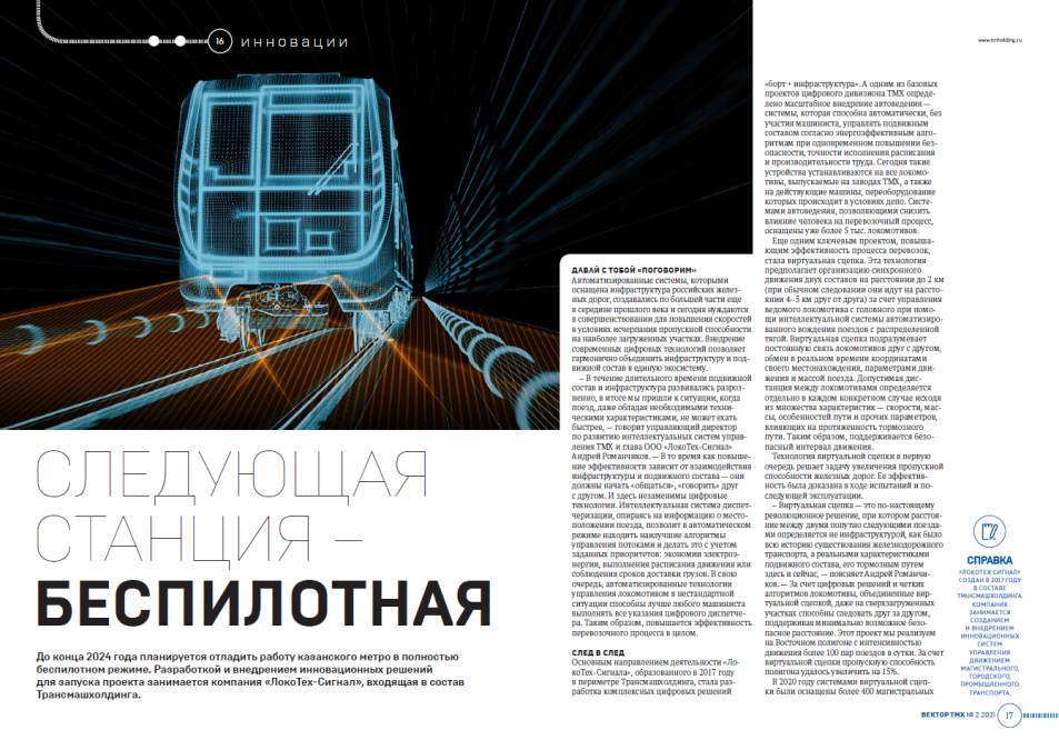 До конца 2024 года планируется отладить работу казанского метро в полностью беспилотном режиме. Разработкой и внедрением инновационных решений для запуска проекта занимается компания «ТМХ Интеллектуальные Системы» (ТМХ ИС, ранее – «ЛокоТех-Сигнал», проведен ребрендинг), входящая в состав Трансмашхолдинга.